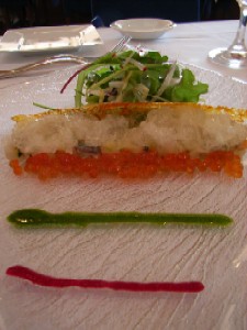 わたくしは前菜に帆立とスモークサーモンのフィロ包み、メインはフィレステーキ