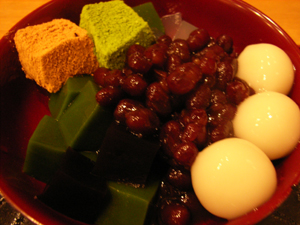 抹茶ゼリーに黒蜜ゼリーなどがわんさか入ったこのあんみつ、